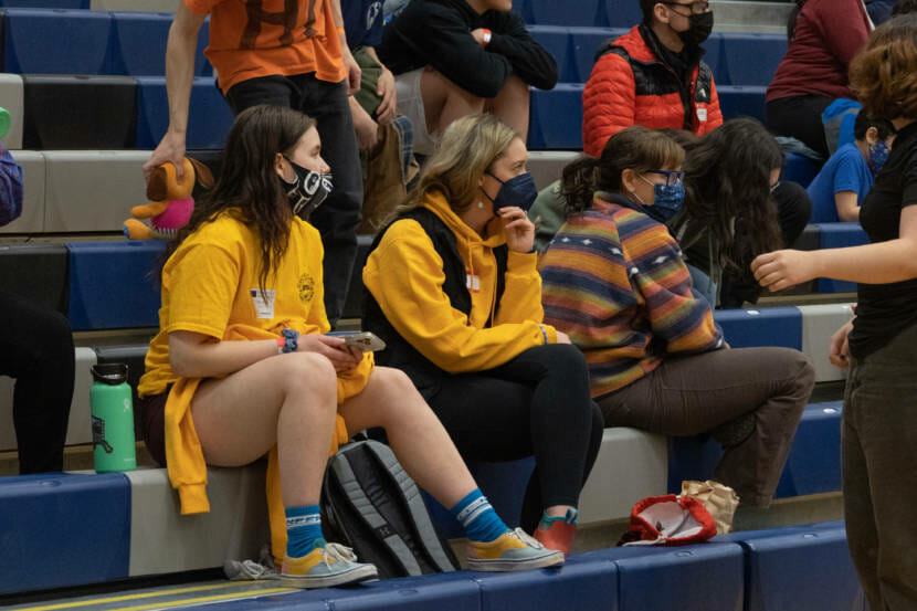 Athletes, coaches and spectators gather on the Thunder Mountain High School gym floor during the Woosh.ji.een dance group performance at the Traditional Games in Juneau, Alaska on April 2, 2022. (Photo by Lyndsey Brollini/KTOO)