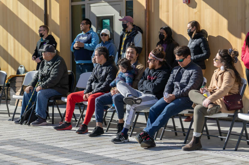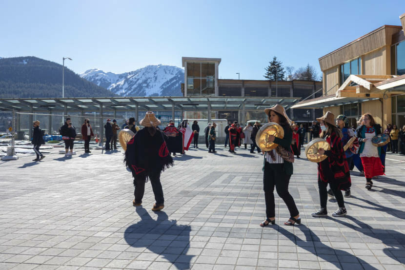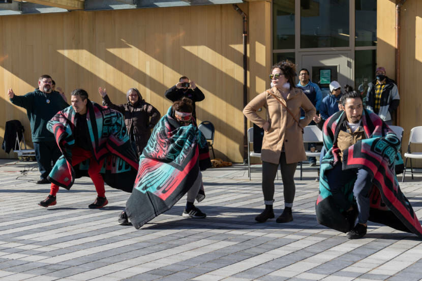 The Yées Ḵu.oo Dancers perform for the celebration of TJ Young finishing a 360-degree totem pole at the Sealaska Heritage Institute Arts Campus in Juneau, Alaska on April 12, 2022. (Photo by Lyndsey Brollini/KTOO)