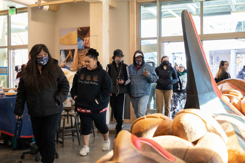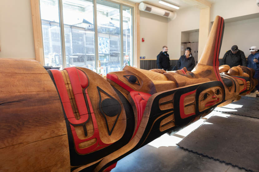 People look at a newly finished totem pole carved by TJ Young, guest carvers and apprentices at the Sealaska Heritage Institute Arts Campus in Juneau, Alaska on April 12, 2022. (Photo by Lyndsey Brollini/KTOO)