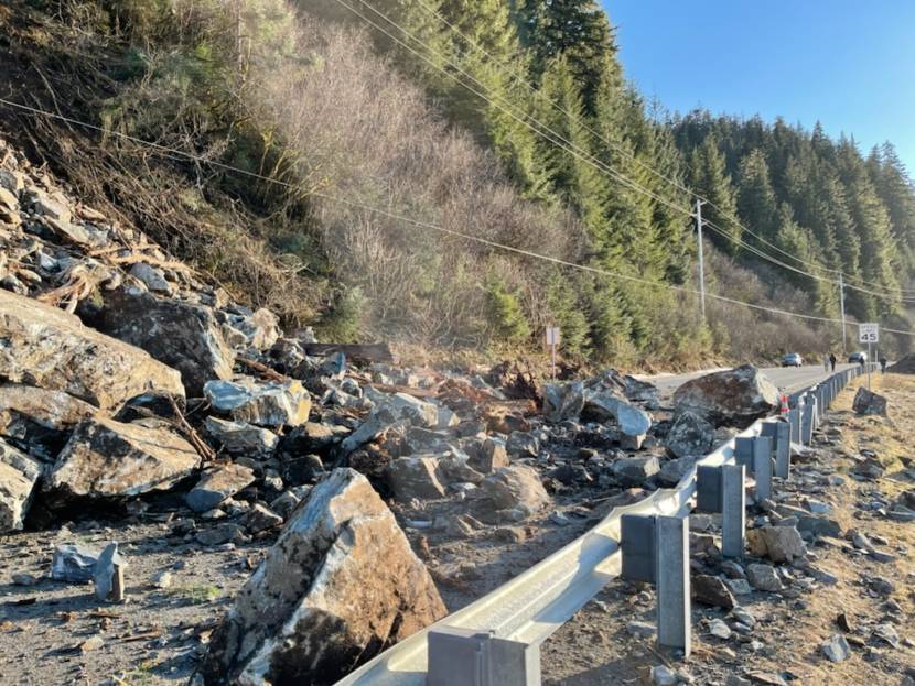 A rock slide blocks the road on the North Douglas Highway in Juneau, Alaska on Sunday, April 10, 2022. (Photo courtesy of the Alaska Department of Transportation & Public Facilities)