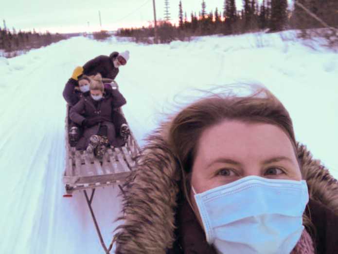 Dr. Katrine Bengaard and her colleagues ride through a Northwest Alaska village to deliver COVID-19 vaccine in December. (courtesy of Katrine Bengaard)