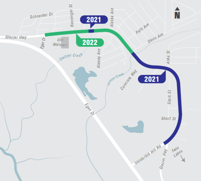 The two-year project will resurface and improve Glacier Highway from the Glacier Highway access road to the intersection with Vanderbilt Hill Road. The current phase of the project is being done between Vanderbilt Hill Road and the Lemon Creek Bridge.