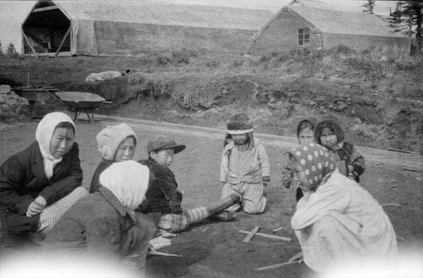 A group of Alaska Native orphans sit outside near Bristol Bay. (Photo courtesy of the Alaska State Archives via Kathryn Ringsmuth)