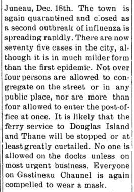 A newspaper article describes Juneau under quarantine in December 1918. (Image courtesy Library of Congress)