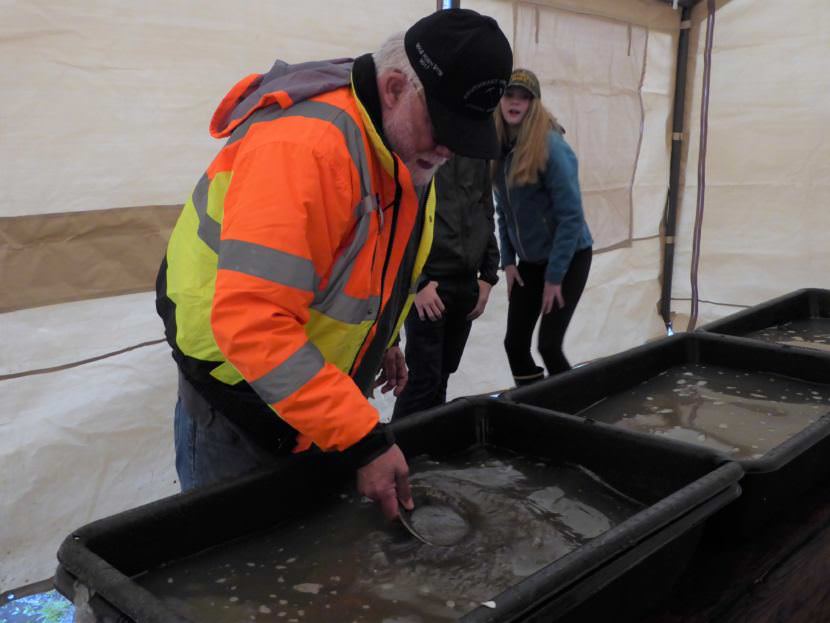 Across the way, Jerry Harmon is inside of a tent planting tiny pieces of gold in three plastic containers full of murky water. He is staging a hands-on gold panning exhibit for a herd of little kids waiting outside.
