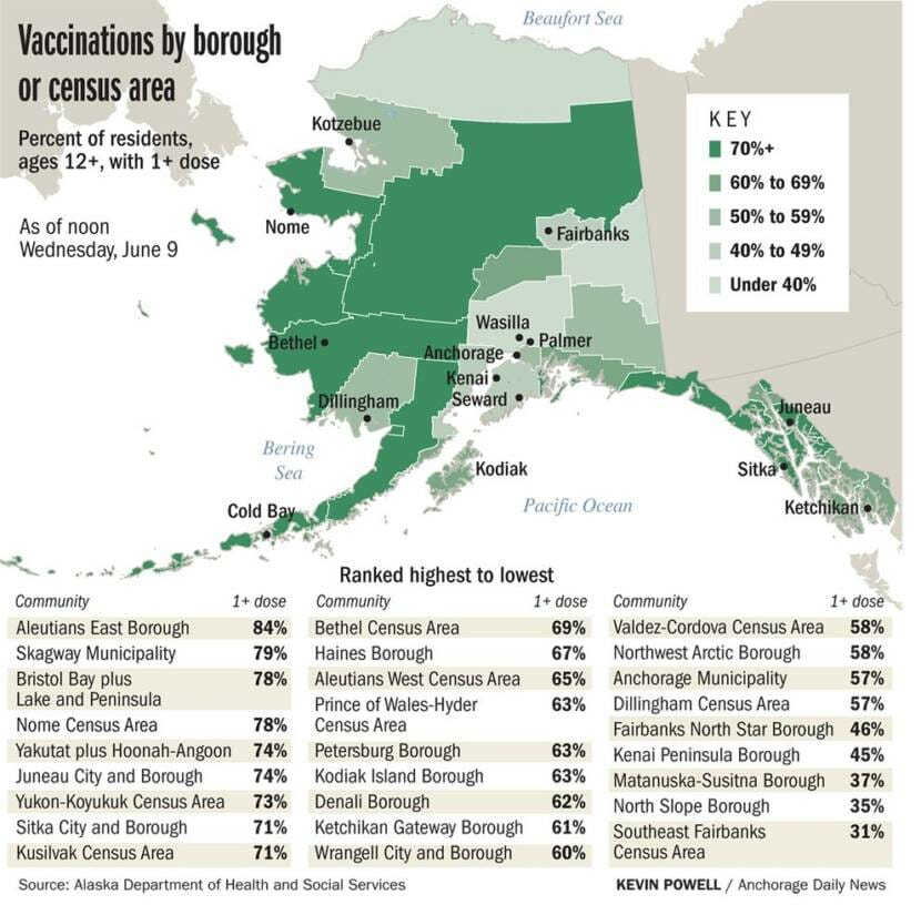 For example, 84% of eligible residents in the Aleutians East Borough — which leads regions statewide — have received at least one dose of vaccine. Regions including Skagway, Bristol Bay and the Nome Census Area are also seeing some of the highest vaccination rates.