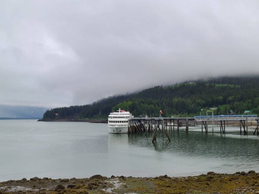 The American Constellation docked in Haines on June 12, 2021 coming from Skagway the day before. Three people connected with the ship tested positive for COVID-19 while it was docked in Petersburg. The ship is headed to Juneau for a 10-day stop and has cancelled its July 14 cruise. (Corinne Smith/KHNS)