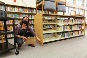 Pisel-Davis points out the wet shelves in the Riverbend Elementary School library. (Photo by Rashah McChesney/KTOO)