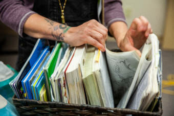 Riverbend Elementary School Principal Elizabeth Pisel-Davis flips through a water-logged basket of books that used to sit on the floor of her office. (Photo by Rashah McChesney/KTOO)