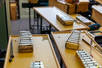 Walking toward the library, she ducked around a corner into a dark room where a pile of musical instruments was shoved into a corner. When the custodians came in and found all the water, they made sure to come to this room and move all of the instruments up and away from the soaked carpet — including a set of xylophones that inmates at Lemon Creek made for the kids to use at home during the pandemic