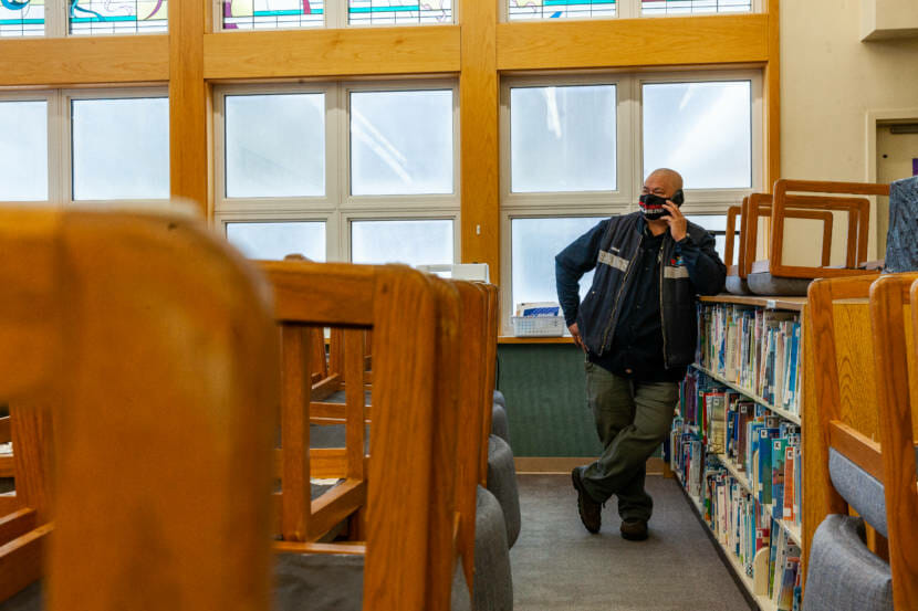 Mark Ibias, a lead maintenance tech with the Juneau School District, stands on waterlogged carpet in the Riverbend Elementary School library on Thursday, Jan. 13, 2022. Two pipes burst in the school and flooded nearly two-thirds of it with water. Ibias says they’ve been scrambling to get it dried out and cleaned up for several days. (Photo by Rashah McChesney)