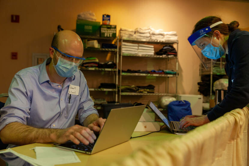 Juneau’s Emergency Operations Manager Robert Barr and Rebecca Embler, a member of Bartlett Hospital quality team during Juneau’s COVID-19 vaccine clinic at Centennial Hall on Jan. 15, 2021, in Juneau. (Photo by Rashah McChesney/KTOO)