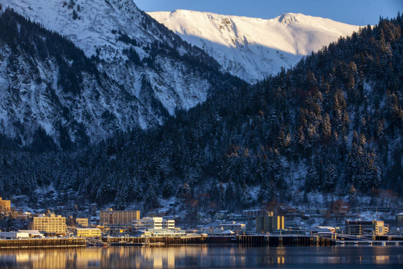 The sun rises over downtown on Dec. 22, 2021, in Juneau, Alaska. (Photo by Rashah McChesney/KTOO)