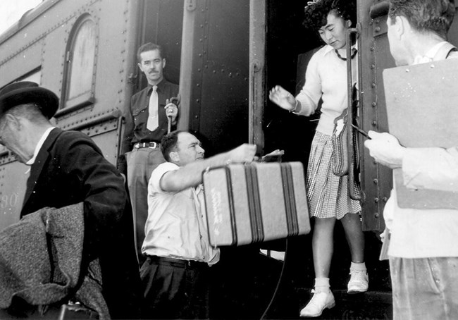 Japanese families arriving in Idaho, where they were sent to the Minidoka Government Relocation Camp near Jerome, Idaho (National Park Service Photo)