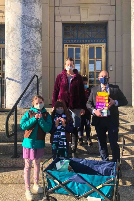 Juneau Senator Jessie Kiehl stocks up on his favorite Girl Scout cookies.