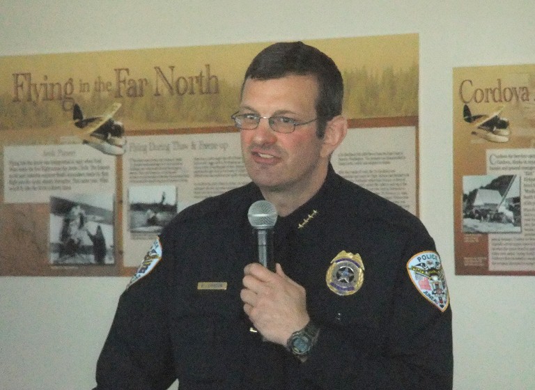 Juneau Police Chief Bryce Johnson at the Chamber of Commerce Thursday in the Alaska Room of the Juneau Airport. (Photo by Rosemarie Alexander/KTOO)