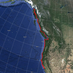 Zachary Brown’s route home from Stanford University, walking and kayaking to Gustavus.