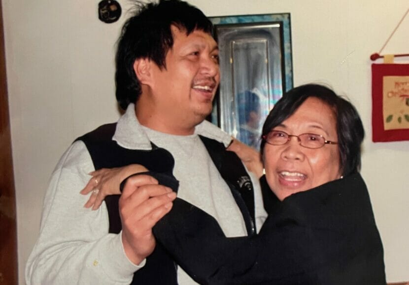 Lope Elizarde, father of Mga Kuwento host Tasha Elizarde, dances with his mother Fely Elizarde inside her home in Juneau, date unknown. Elizardes still own this house, where many of them lived when the family first migrated to Juneau, Alaska. (Photo courtesy of Tasha Elizarde)
