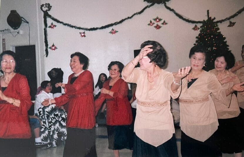 Fely Elizarde (second from left), grandmother of Mga Kuwento host Tasha Elizarde, dances at a Christmas party hosted by Filipino Community, Inc. in Juneau with other elders, date unknown. (Photo courtesy of Tasha Elizarde)