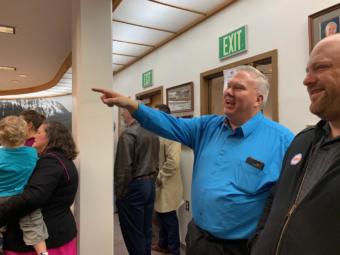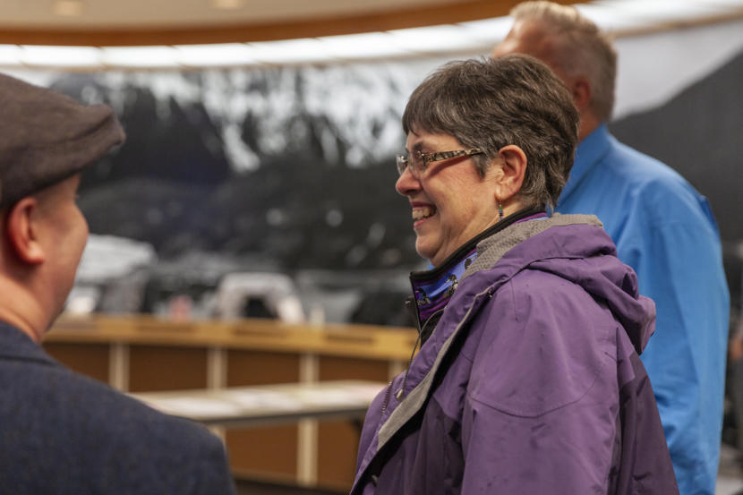 Deedie Sorensen laughs with friends at Juneau City Hall as results of the municipal election roll in on Tuesday, Oct. 1, 2019, in Juneau. (Photo by Rashah McChesney/KTOO)