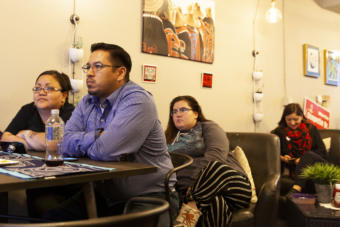 Martin Stepetin Sr. watches results roll in for a school board seat he has been running to fill, Oct. 1, 2019, in Juneau. (Photo by Rashah McChesney/KTOO)