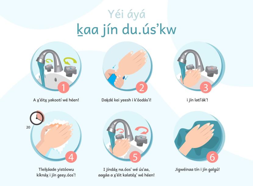 Ḵaaḵal.aat Florence Sheakley, Ḵaanáḵ Ruth Demmert and X̱ʼunei Lance Twitchell also created a poster detailing the steps of proper hand washing.
