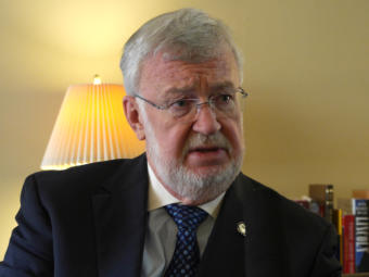 Sen. Gary Stevens, R-Kodiak, talks with a reporter in Steven’s office at the Capitol on March 13, 2020, in Juneau. They discussed the legislature’s closure of the Capitol to most members of the public in response to the coronavirus pandemic. (Photo by Skip Gray/KTOO)