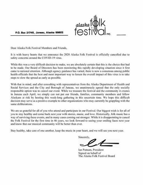 In a letter, the festival’s Board President Ian Putnam wrote that the board has been consulting with the state and the City and Borough of Juneau. All agreed that the only “socially responsible” option was to cancel the event.