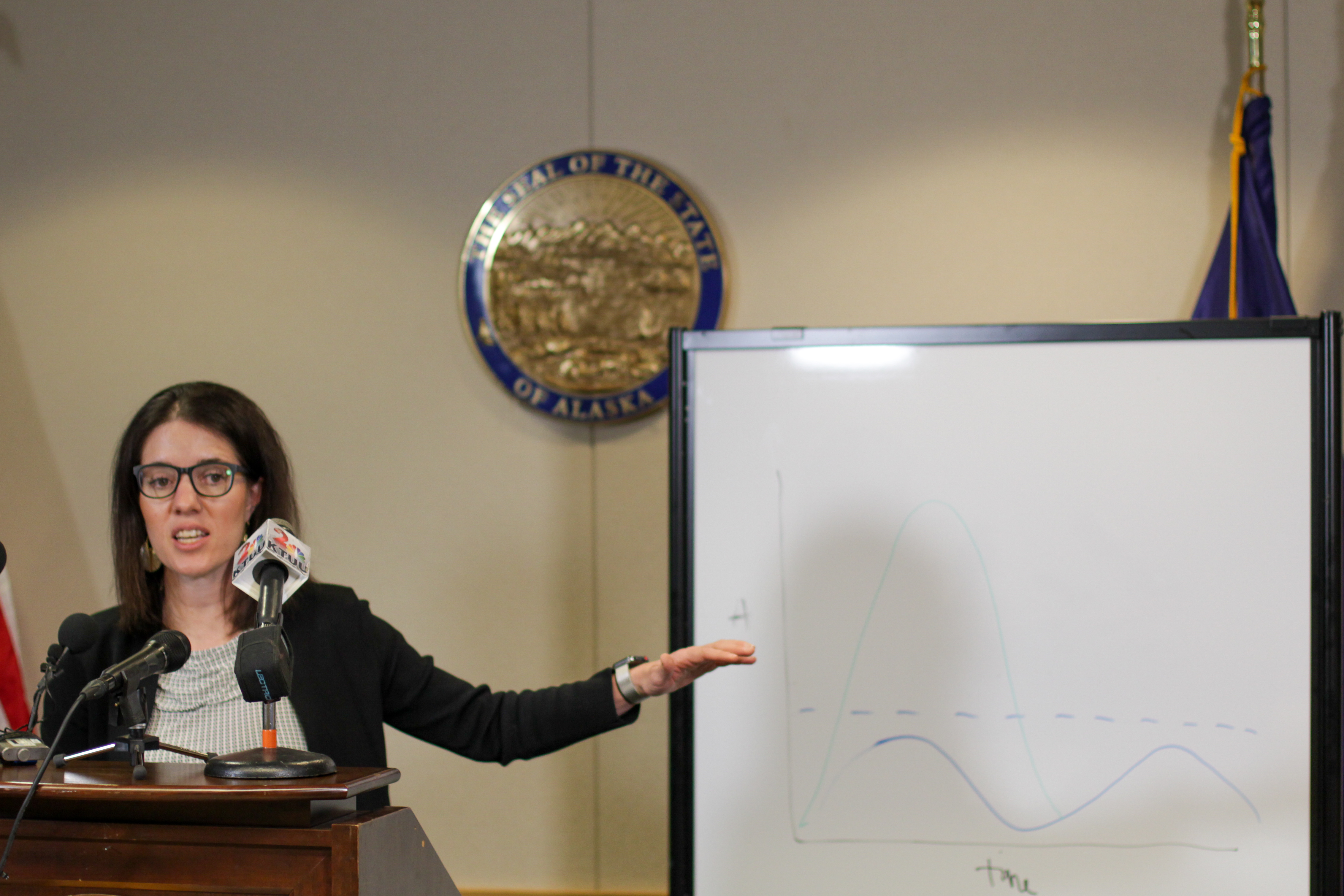 Alaska Chief Medical Officer Dr. Anne Zink stresses the importance of slowing the spread of the coronavirus at a news conference at Gov. Mike Dunleavy’s Anchorage office on Wednesday. Zink said on Tuesday that state public health workers are on the phone daily with groups weighing whether to cancel or postpone events due to the virus. (Photo by Nat Herz/Alaska Public Media)
