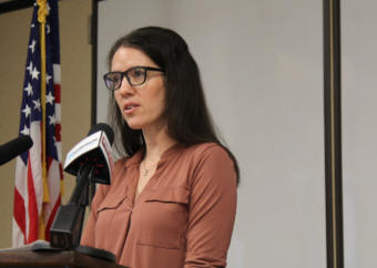 Alaska’s Chief Medical Officer Dr. Anne Zink speaking at a press conference in Anchorage about the flight carrying 201 passengers from Wuhan, China, the epicenter of the coronavirus, that landed in Anchorage on Jan. 29. On Monday, she spoke at a press conference in Anchorage about the virus. (Photo by Zachariah Hughes/Alaska Public Media)