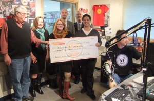A check for $3,000, Part of the proceeds from the Battle of the Bands Battle Against Cancer was presented during a live broadcast on KXLL to Nicole Hallingstad of the Juneau Cancer Connection. Also present were (L to R) John Beiler of KTOO, Jeanne Pederson of Capital City Weekly, Melissa Griffiths of the Juneau Empire, John Blasco and Tom Sullivan of event sponsors Alaska Pacific Bank and Andy Kline of KXLL.