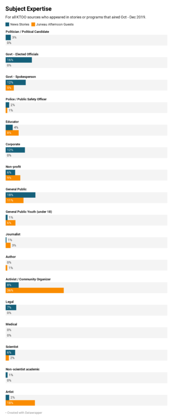 One trend I’m particularly interested in is the percentage of “general public” we include on our airwaves, especially since we know there’s an equal opportunity to talk to a man or a woman when things like expertise, educational background or profession don’t dictate why we’re talking to someone. For both Juneau Afternoon and our news stories, this is trending up — which is a result of an intentional effort to talk to more “regular people” about the pandemic and how it is impacting our community.