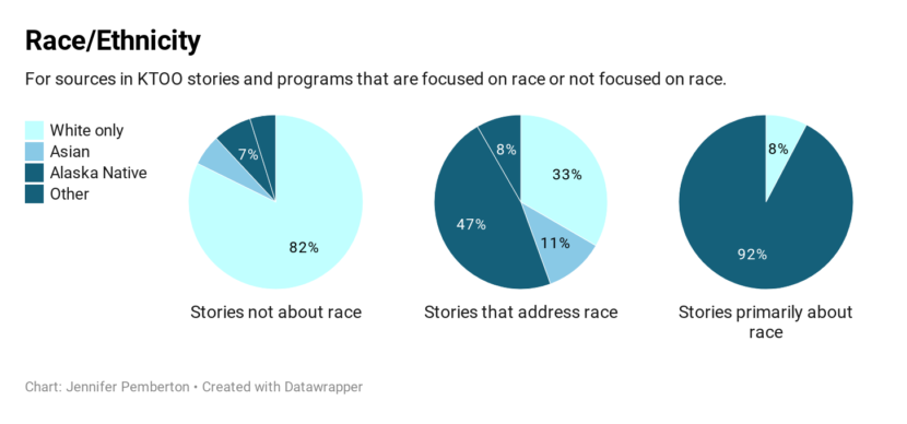 While 69% of Juneau’s residents identify as white-only, 79% of KTOO’s total sources for the past three months were white-only. And over the past nine months, the percentage of white-only sources in our coverage hasn’t changed much. (When we looked at this data in December, 75% of sources were white-only; in March, that number was 77%).