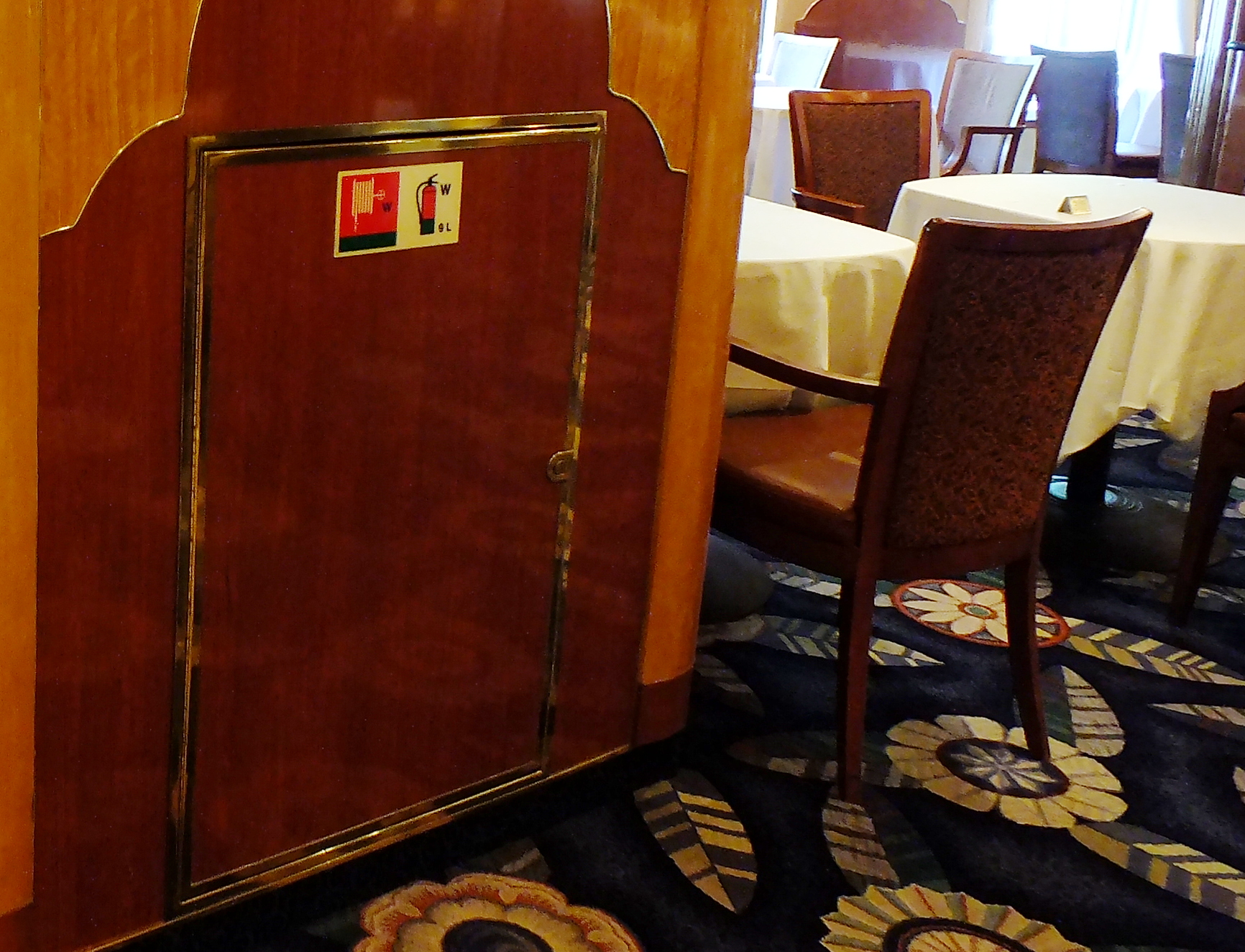Firefighting resources are located all around the ship, sometimes hidden in plain sight in a dining room aboard the cruise ship Queen Elizabeth. (Photo by Matt Miller/KTOO)