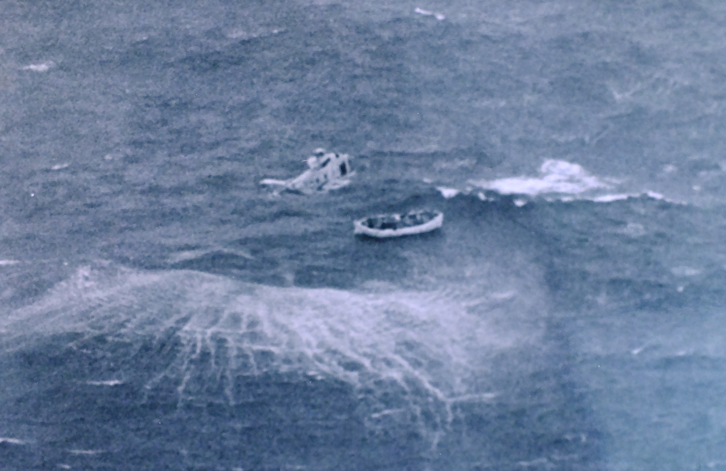 A helicopter prepares to rescue survivors from a life raft during the Prisendam rescue in October 1980. (Photo courtesy of U.S. Coast Guard