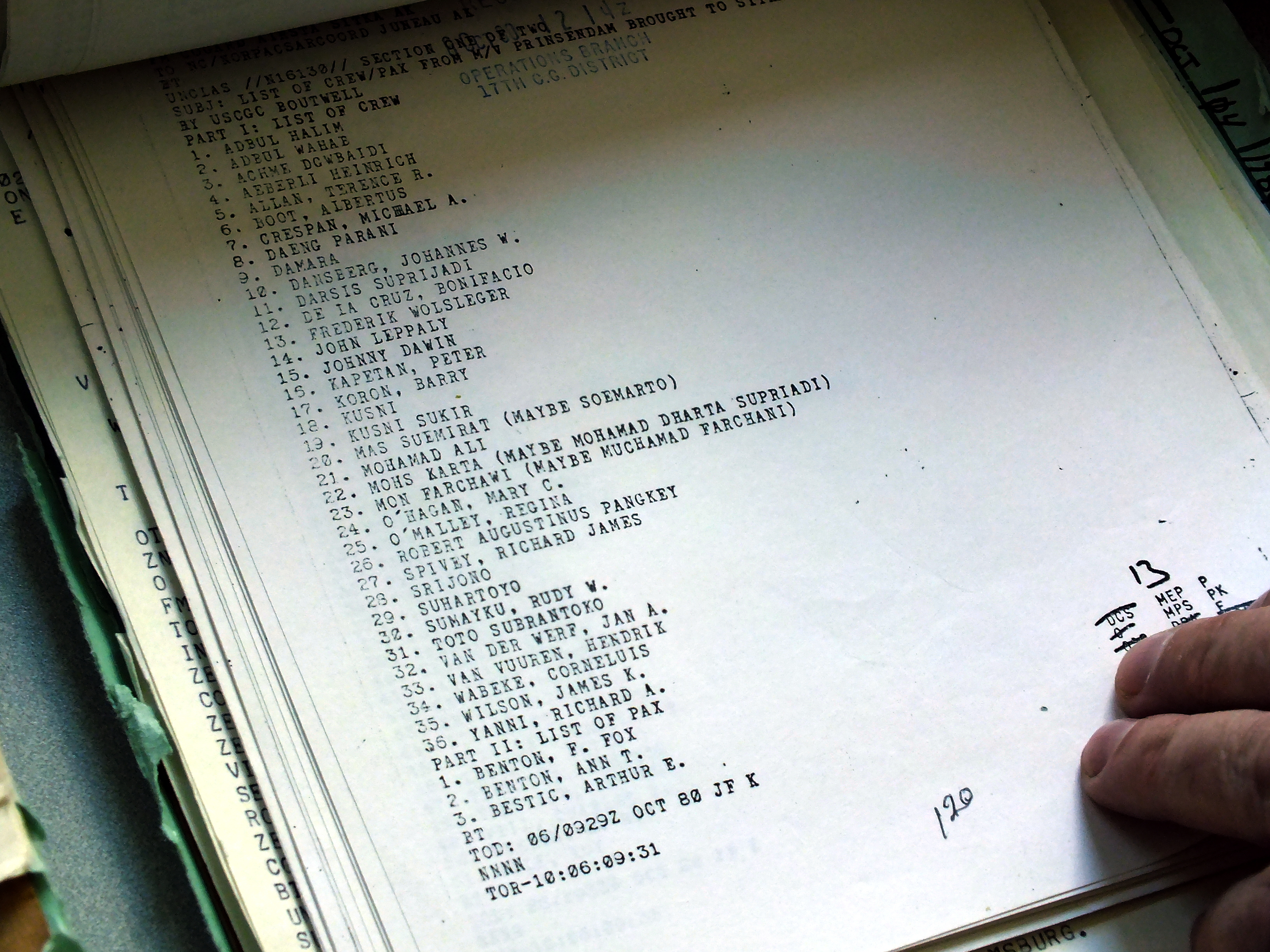 A list of passengers evacuated to Sitka, Alaska during the search and rescue of the Prisendam in October 1980. Is that really Yanni at number 36? (Photo by Matt Miller/KTOO)