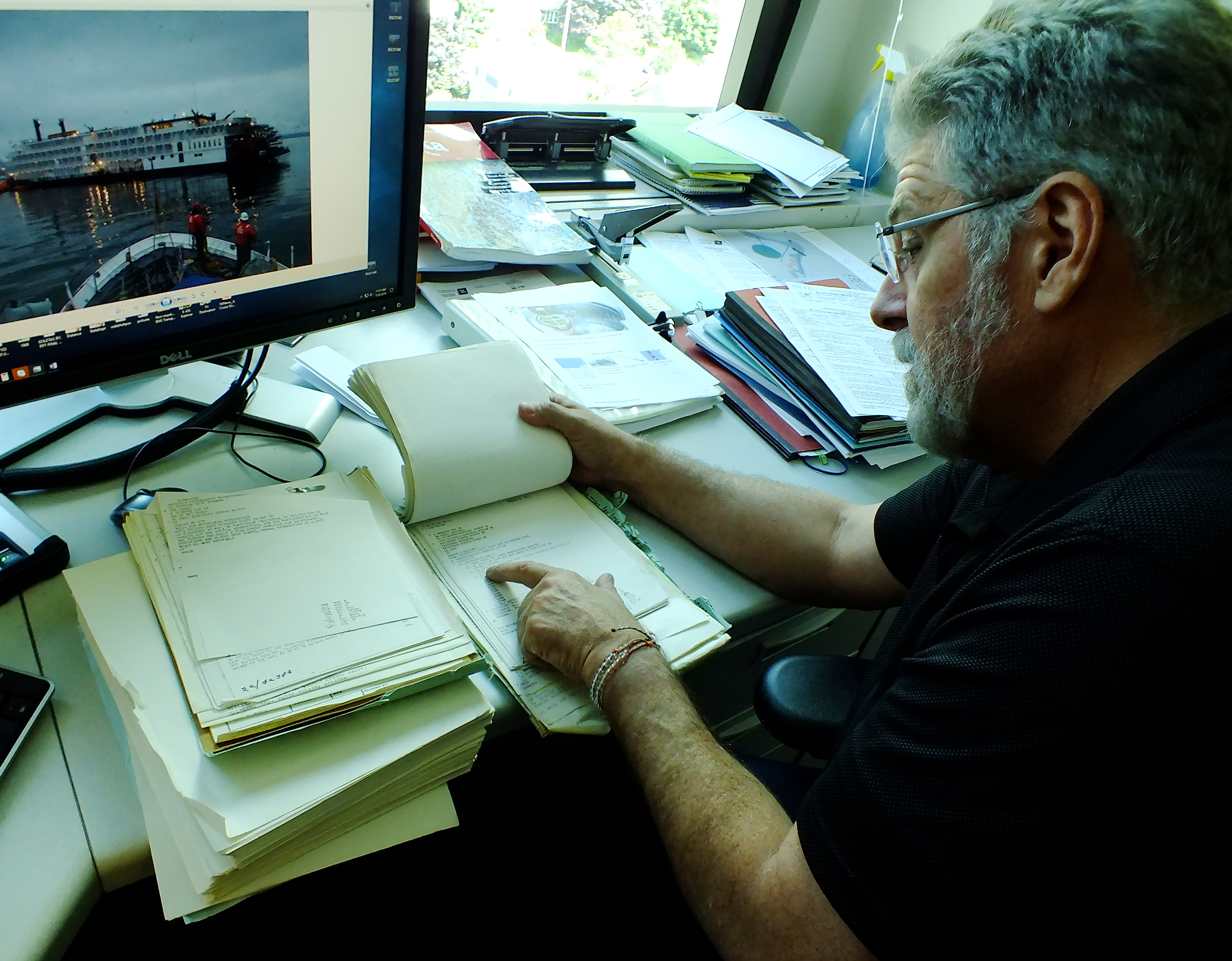 Paul Webb, who served aboard the U.S. Coast Guard buoy tender Woodrush during the Prisendam fire, goes through an archived file of documents preserved from the original search and rescue operation. On the computer screen in front of him is a picture of another cruise ship that encountered trouble in Southeast Alaska, the sternwheeler Empress of the North, which grounded on a rock near Juneau in 2007. (Photo by Matt Miller/KTOO)
