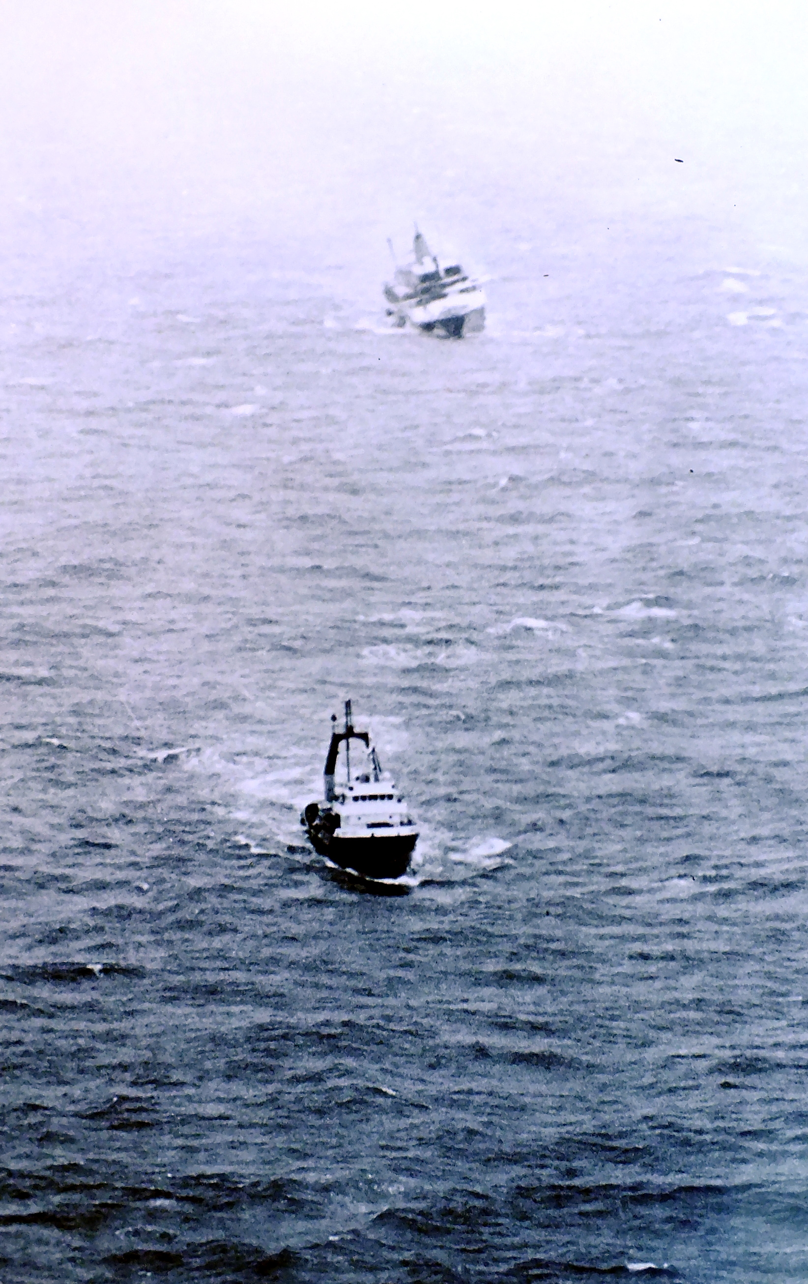 Another ship takes the cruise ship Prisendam under tow after a fire crippled the vessel in October 1980. Headed to a potential port in the Pacific Northwest for repairs, it later sank. (Photo courtesy of U.S. Coast Guard)