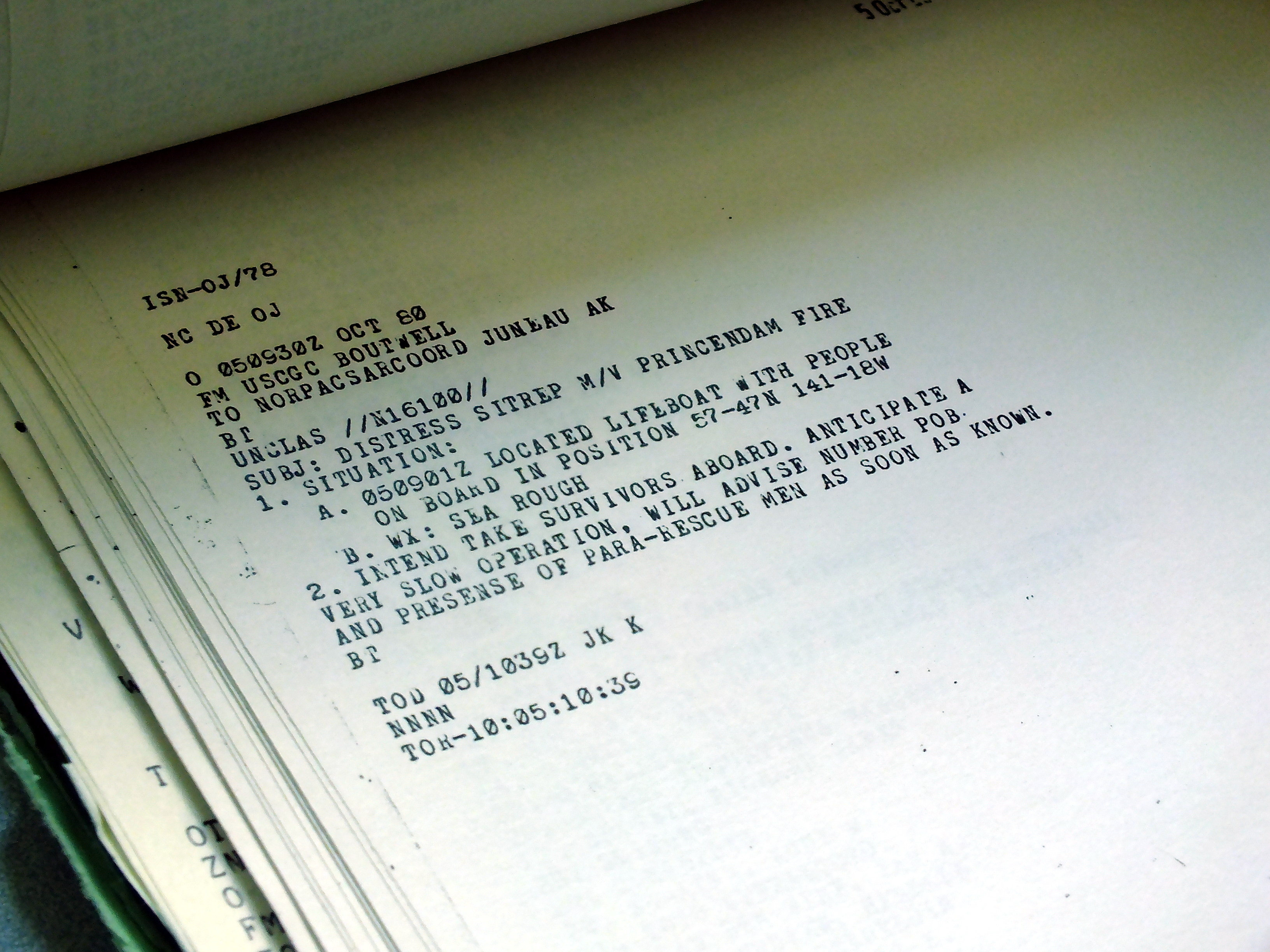 One of the last messages received from a U.S. Coast Guard cutter during the Prisendam search and rescue in the Gulf of Alaska in October 1980. (Photo by Matt Miller/KTOO)