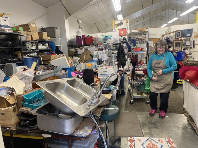 Mary Ellen Frank stands next to the sorting table at the Salvation Army Family Store. All the donated household items – including two kitchen sinks – are examined and priced here by volunteers (Anna Canny/KTOO)