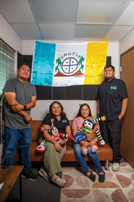 KUYI-Hopi Radio staff (from left) Darion Kootswatewa, Samantha Honani Molina, Brennyn Masawytewa, and Josh Sakenima. Molina and Masawytewa hold dolls of the station’s mascot. (Deidra Peaches/High Country News)