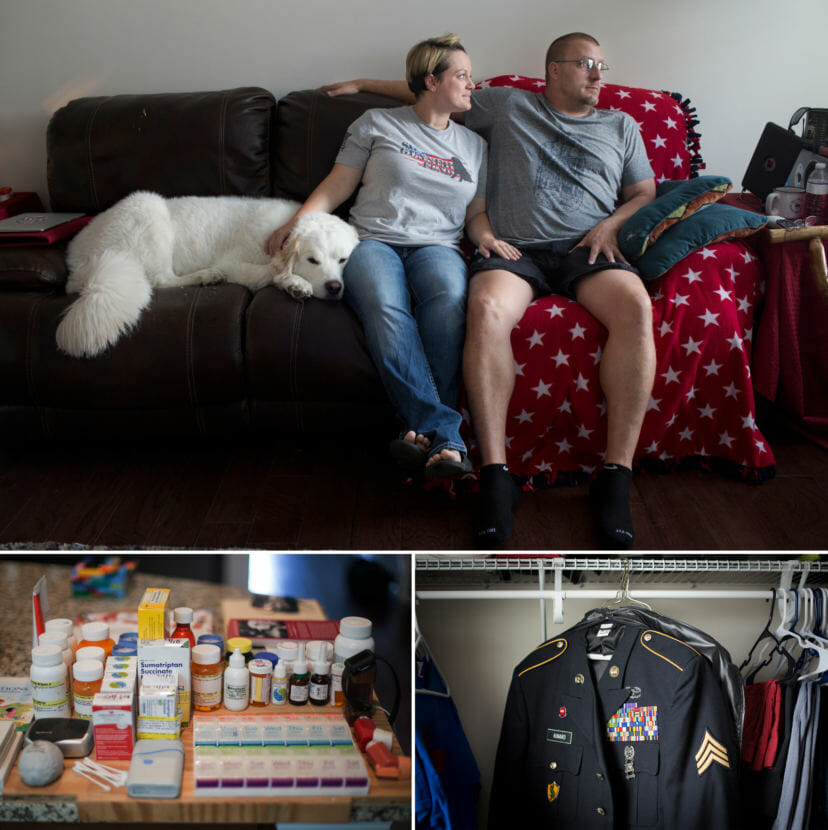 (Top) Britnee Kinard’s husband, Hamilton, has a brain injury and PTSD. She got kicked off the program by the Charleston VA in 2014. (Left) Hamilton’s daily medication. (Right) His uniform in the closet at their home in Richmond Hill, Va. (Photos by Eva Verbeeck for NPR)