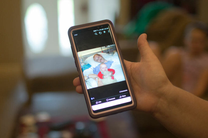 Jenn Wilmot shows a picture of George after his accident. He was thrown free from the gunner’s turret as his Humvee tumbled off a cliff in Iraq. He survived, but with a brain injury, PTSD and a left arm that still looks sewn-on. (Photo by Eva Verbeeck for NPR)