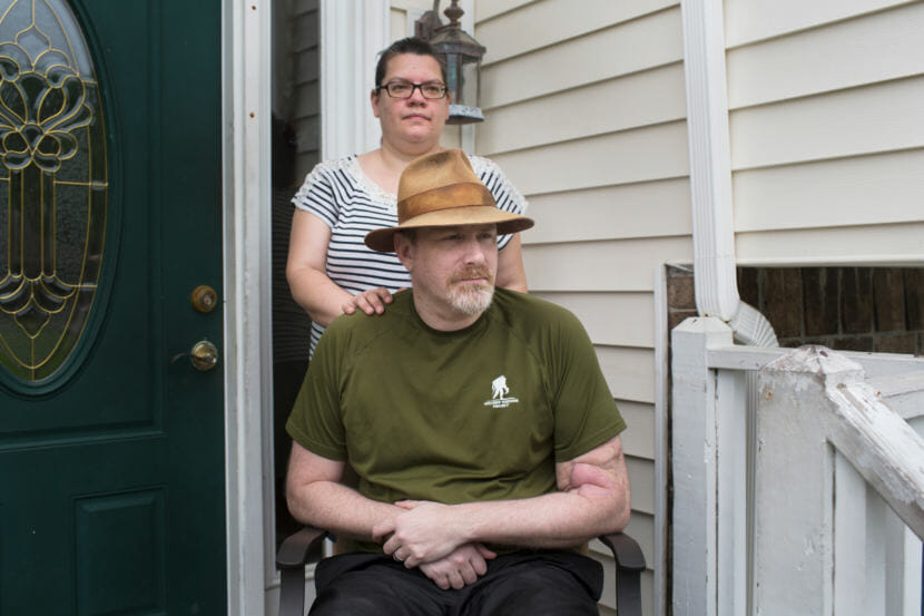 George Wilmot gets lost easily, forgets things — like a pot on the stove — and sometimes falls down without warning. His wife, Jenn, hasn’t been able to work outside the home because taking care of George is a full-time (Photo by Eva Verbeeck for NPR)