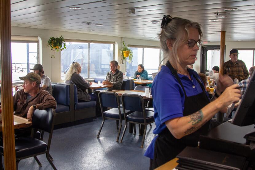 Back in False Pass, on board the Tustumena, the galley was packed at 6:30 p.m., right when the ferry was supposed to leave. Standing in the galley, Mayer started to sound more like a restaurant manager than a boat captain.