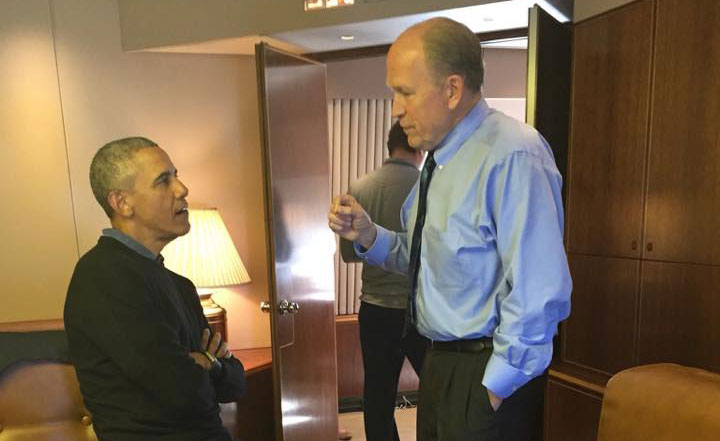 Gov. Bill Walker talks with President Barack Obama on Air Force one. The president is visiting Alaska to observe the effects of climate change. (Photo courtesy of Gov. Bill Walker’s office)