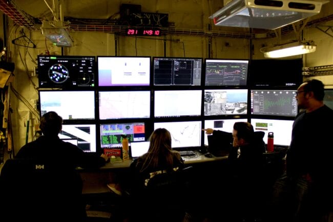 Researchers from the National Oceanic and Atmospheric Administration Ship Fairweather and the University of New Hampshire analyze mapping data in the U.S. Coast Guard Cutter Healy’s computer lab while the cutter transits the Beaufort Sea on Oct. 16. (Photo by Lt. j.g. Haley Howard/U.S. Coast Guard)