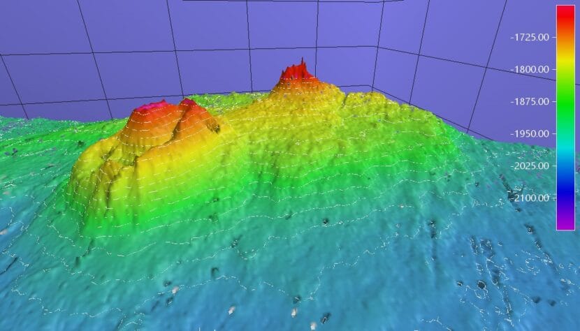 New data is used to map a volcano-like feature discovered this fall by science teams aboard the U.S. Coast Guard Cutter Healy, a polar-class icebreaker used for Arctic research. The scientists found the structure on the continental slope off northern Alaska. (Image provided by the National Oceanic and Atmospheric Administration)