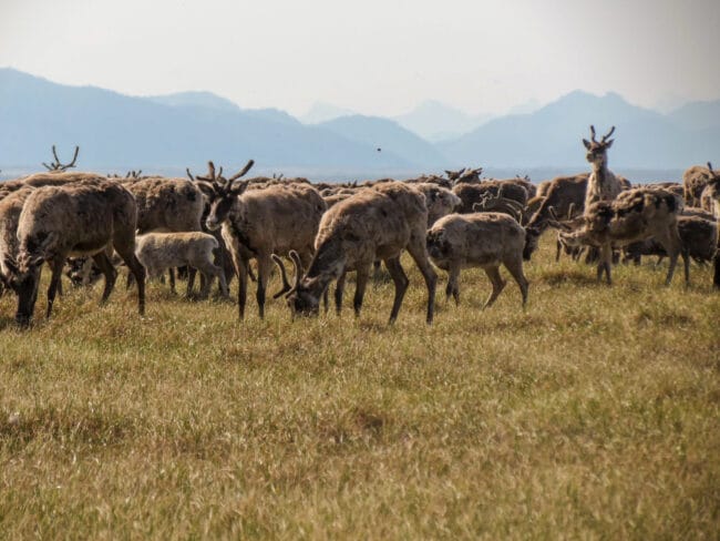 Caribou graze on July 9, 2019, on tundra plants growing on the coastal plain of the Arctic National Wildlife Refuge. The animals are in the Porcupine Caribou Herd. A new environmental study released by the Biden administration recommends more protections for the Porcupine herd, which packs into the refuge coastal plain during calving season. (Photo by Andrea Medeiros/U.S. Fish and Wildlife Service)