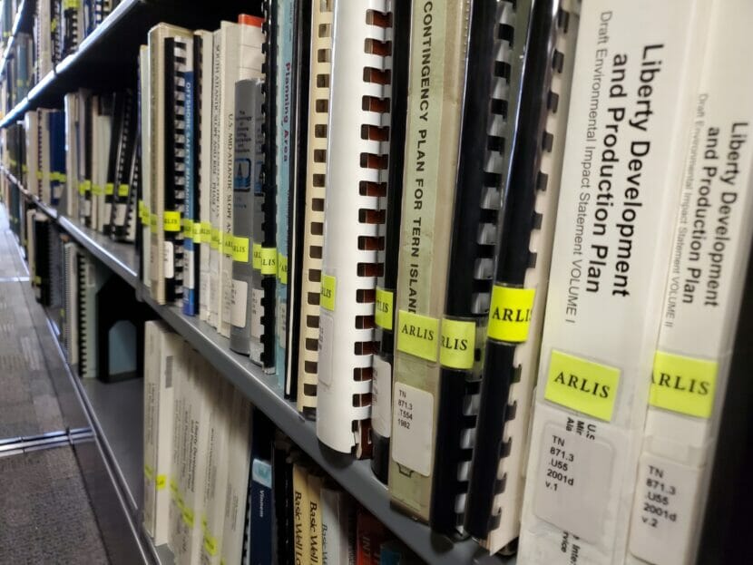 A copy of the two-volume 2001 draft environmental impact statement on the BP’s first development plan for the Liberty field is seen on a shelf on Thursday at the Alaska Resources Library and Information Services on the University of Alaska Anchorage campus. More volumes analyzing Liberty development plans are on other shelves at the library. So far, three separate Liberty development plans have been proposed. (Photo by Yereth Rosen/Alaska Beacon)